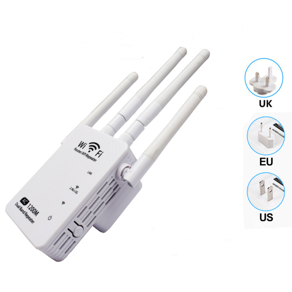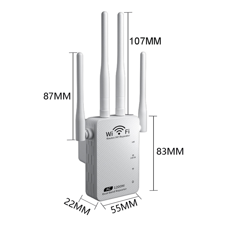 street ,home or etc. For example, the normal enhancer can expend distance up to 50~100 meters away. If there are more repeaters or more bigger power repeater, the range will extended further; the Repeater simultaneously supports 2.4G and 5G wireless network connection, and it can supports 2.4G or 5G transmission speeds of up to 1200M. It has 2dBi Antennas providing even better wireless performance, transmission rate , stability technology automatically avoids channel conflicts using its channel selection feature.